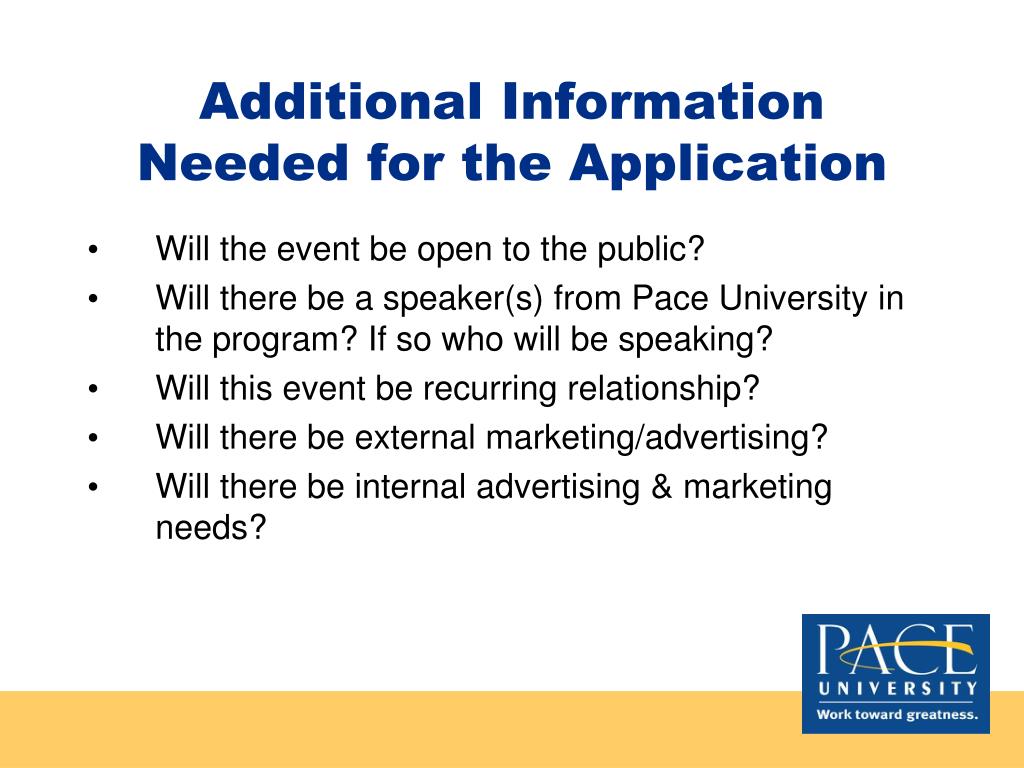 Additional Information Needed for the Application • Will the event be open to the public? • Will there be a speaker(s) from Pace University in the program? If so who will be speaking? • Will this event be recurring relationship? • Will there be external marketing/advertising? • Will there be internal advertising & marketing needs?