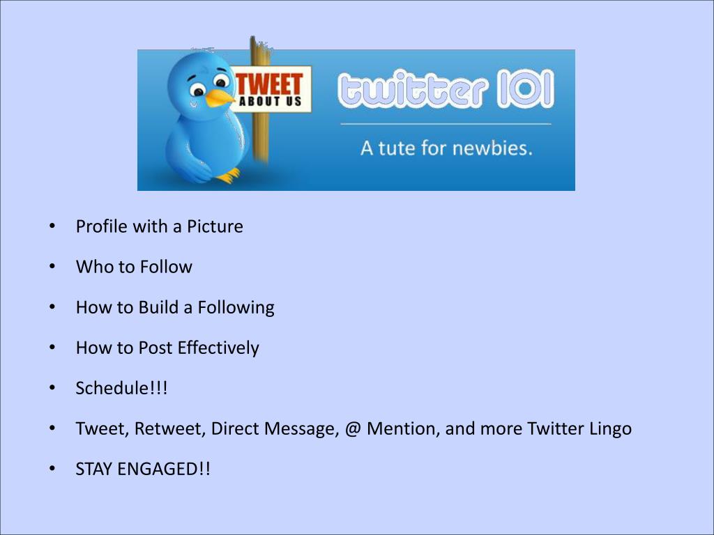 Profile with a Picture • Who to Follow • How to Build a Following • How to Post Effectively • Schedule!!! • Tweet, Retweet, Direct Message, @ Mention, and more Twitter Lingo • STAY ENGAGED!!