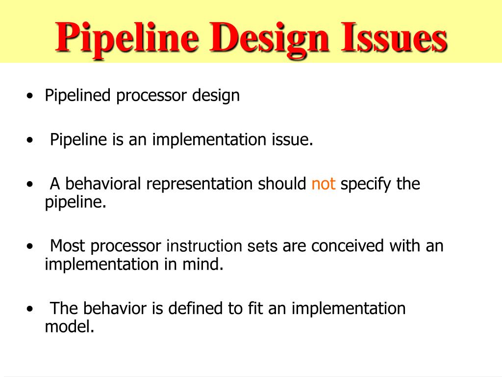 Pipeline Design Issues • Pipelined processor design • Pipeline is an implementation issue. • A behavioral representation should not specify the pipeline. • Most processor instruction sets are conceived with an implementation in mind. • The behavior is defined to fit an implementation model.