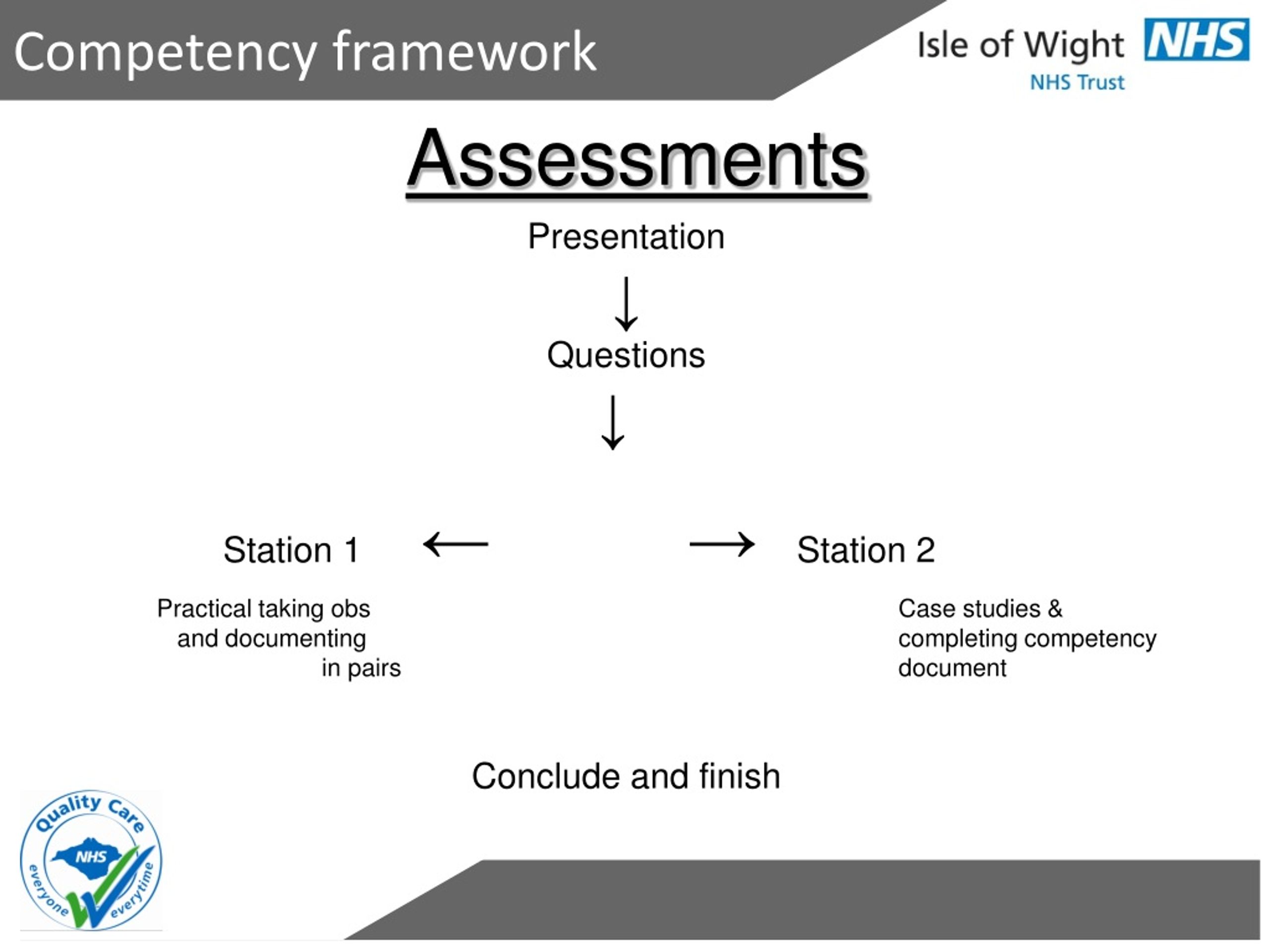 Competency framework Assessments Presentation ↓ Questions ↓ Station 1 ←→ Station 2 Practical taking obs Case studies & and documenting completing competency in pairs document Conclude and finish