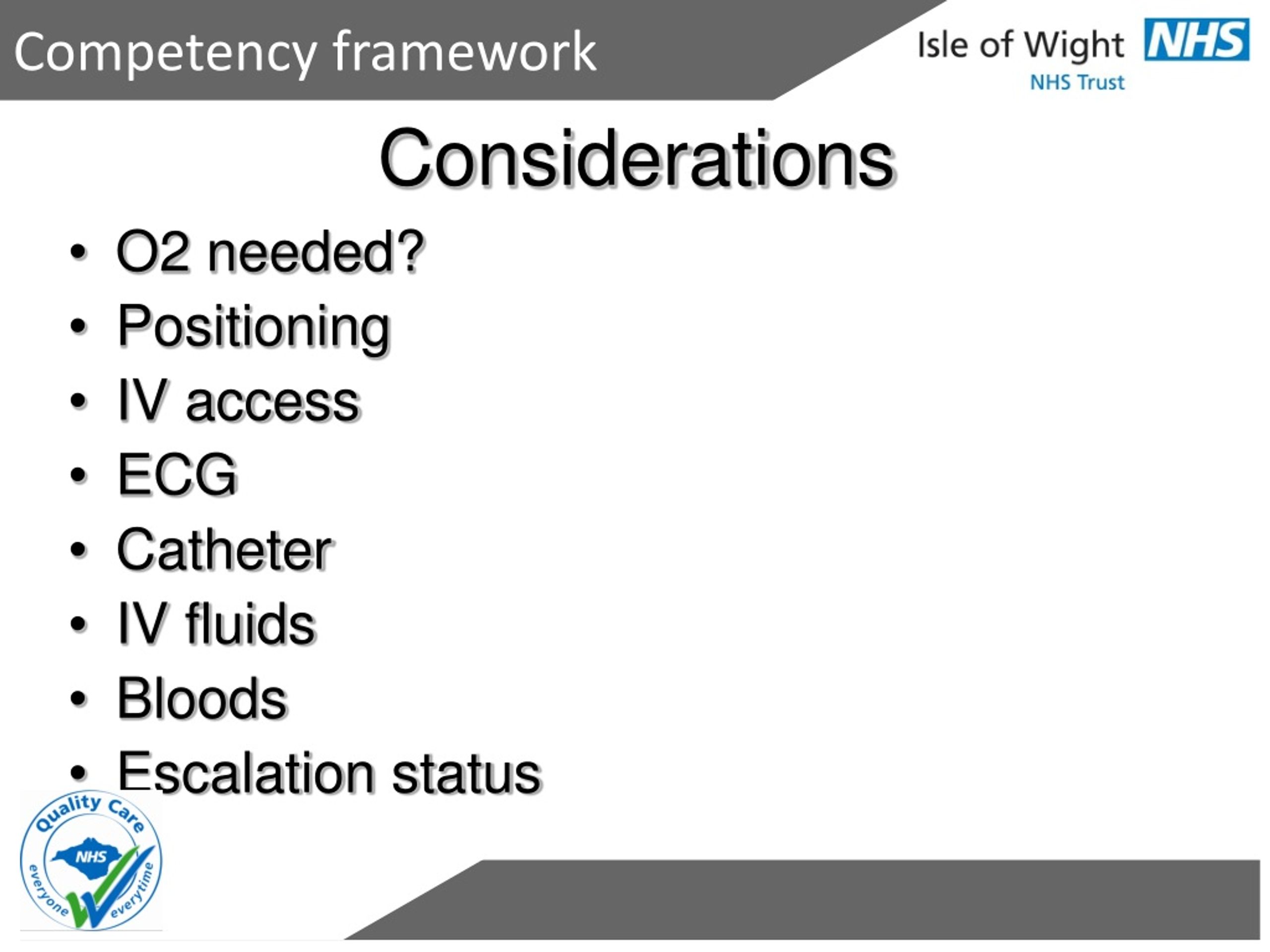 Competency framework Considerations • O2 needed? • Positioning • IV access • ECG • Catheter • IV fluids • Bloods • Escalation status