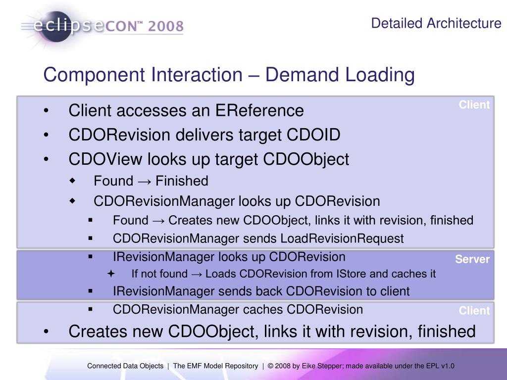 Detailed Architecture Component Interaction – Demand Loading Client • Client accesses an EReference • CDORevision delivers target CDOID • CDOView looks up target CDOObject • Found → Finished • CDORevisionManager looks up CDORevision • Found → Creates new CDOObject, links it with revision, finished • CDORevisionManager sends LoadRevisionRequest • IRevisionManager looks up CDORevision • If not found → Loads CDORevision from IStore and caches it • IRevisionManager sends back CDORevision to client • CDORevisionManager caches CDORevision • Creates new CDOObject, links it with revision, finished Server Client