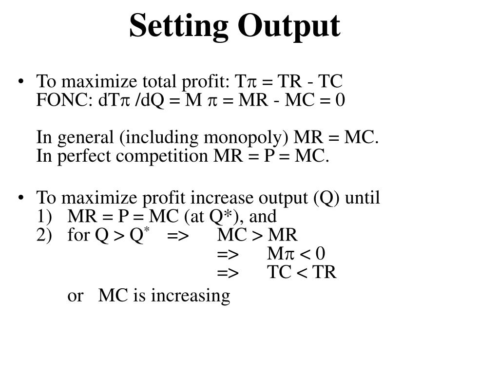 Setting Output To maximize total profit: T = TR - TCFONC: dT/dQ = M = MR - MC = 0In general (including monopoly) MR = MC.In perfect competition MR = P = MC. To maximize profit increase output (Q) until 1) MR = P = MC (at Q*), and2) for Q > Q* => MC > MR => M < 0 => TC < TR or MC is increasing