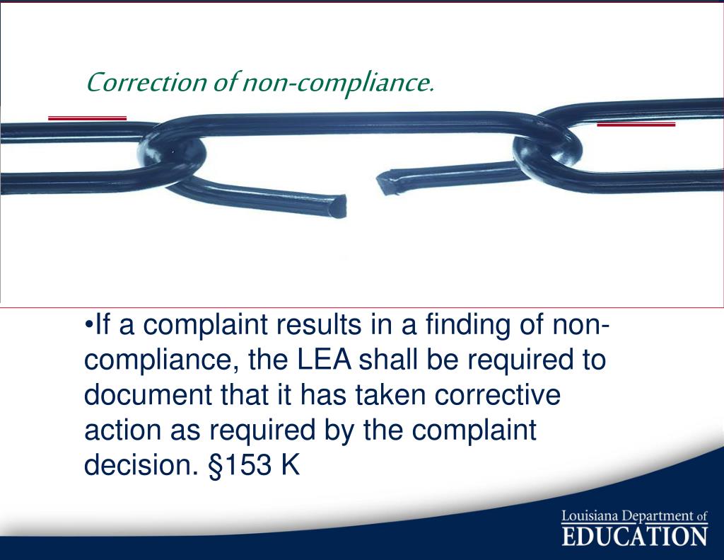 Correction of non-compliance. • If a complaint results in a finding of non-compliance, the LEA shall be required to document that it has taken corrective action as required by the complaint decision. §153 K