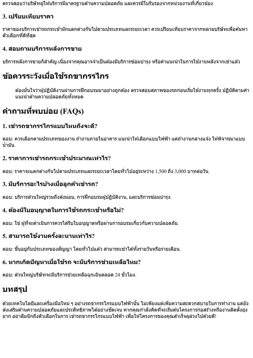 ตรวจสอบว่าบริษัทผู้ให้บริการมีมาตรฐานด้านความปลอดภัยและควรมีใบรับรองจากหน่วยงานที?เกี?ยวข้องตรวจสอบว่าบริษัทผู้ให้บริการมีมาตรฐานด้านความปลอดภัยและควรมีใบรับรองจากหน่วยงานที?เกี?ยวข้อง 3. เปรียบเทียบราคา ราคาของบริการเช่ารถกระเช้ามักแตกต่างกันไปตามประเภทและระยะเวลาควรเปรียบเทียบราคาจากหลายบริษัทเพื?อค้นหา ตัวเลือกที?ดีที?สุด 4. สอบถามบริการหลังการขาย บริการหลังการขายก็สําคัญเนื?องจากคุณอาจจําเป็นต้องมีบริการซ่อมบํารุงหรือคําแนะนําในการใช้งานหลังจากเช่าแล้ว ข้อควรระวังเมื?อใช้รถขากรรไกร ต้องมั?นใจว่าผู้ปฏิบัติงานผ่านการฝึกอบรมมาอย่างถูกต้องตรวจสอบสภาพของรถก่อนเริ?มใช้งานทุกครั?งปฏิบัติตามคํา แนะนําด้านความปลอดภัยทั?งหมด คําถามที?พบบ่อย (FAQs) 1. เช่ารถขากรรไกรแบบไหนถึงจะดี? ตอบ: ควรเลือกตามประเภทของงานถ้างานภายในอาคารแนะนําให้เลือกแบบไฟฟ้าแต่ถ้างานกลางแจ้งให้พิจารณาแบบ นํ?ามัน. 2. ราคาการเช่ารถกระเช้าประมาณเท่าไร? ตอบ: ราคาจะแตกต่างกันไปตามประเภทและระยะเวลาโดยทั?วไปอยู่ระหว่าง 1,500 ถึง 3,000 บาทต่อวัน. 3. มีบริการอะไรบ้างเมื?อลูกค้าเช่ารถ? ตอบ: บริการส่วนใหญ่รวมถึงส่งมอบ, การฝึกอบรมผู้ปฏิบัติงาน, และบริการซ่อมบํารุง. 4. ต้องมีใบอนุญาตในการใช้รถกระเช้าหรือไม่? ตอบ: ใช่ผู้ที?จะดําเนินการควรได้รับใบอนุญาตหรือผ่านการอบรมเกี?ยวกับความปลอดภัย. 5. สามารถใช้งานครั?งละนานเท่าไร? ตอบ: ขึ?นอยู่กับประเภทของสัญญาโดยทั?วไปแล้วสามารถเช่าได้ทั?งรายวันหรือรายเดือน. 6. หากเกิดปัญหาเมื?อใช้รถจะมีบริการช่วยเหลือไหม? ตอบ: ส่วนใหญ่บริษัทจะมีบริการช่วยเหลือฉุกเฉินตลอด 24 ชั?วโมง. บทสรุป ด้วยเทคโนโลยีและเครื?องมือใหม่ๆอย่างรถขากรรไกรแบบไฟฟ้านั?นไม่เพียงแต่เพิ?มความสะดวกสบายในการทํางานแต่ยัง ส่งเสริมด้านความปลอดภัยและประสิทธิภาพได้อย่างชัดเจนหากคุณกําลังคิดที?จะเริ?มต้นโครงการก่อสร้างหรืองานติดตั?งยุ่ง ยากอย่าลืมนึกถึงตัวเลือกในการเช่ารถขากรรไกรแบบไฟฟ้าเพื?อให้โครงการของคุณสําเร็จลุล่วงไปด้วยดี!