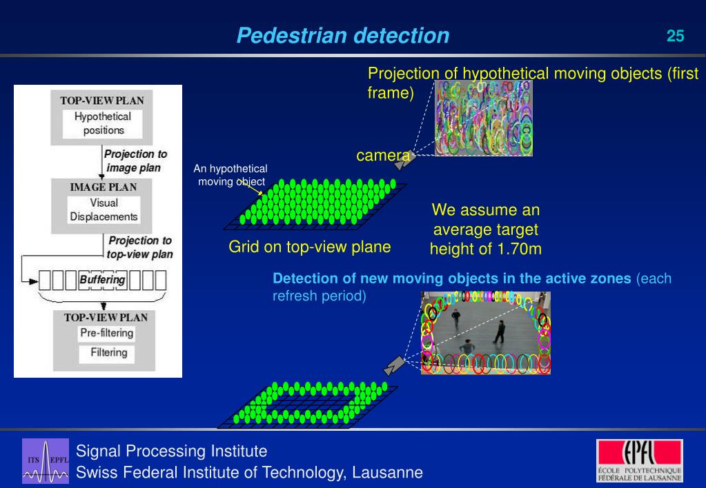 Projection of hypothetical moving objects (first frame) Detection of new moving objects in the active zones (each refresh period) camera An hypothetical moving object We assume an average target height of 1.70m Grid on top-view plane Pedestrian detection