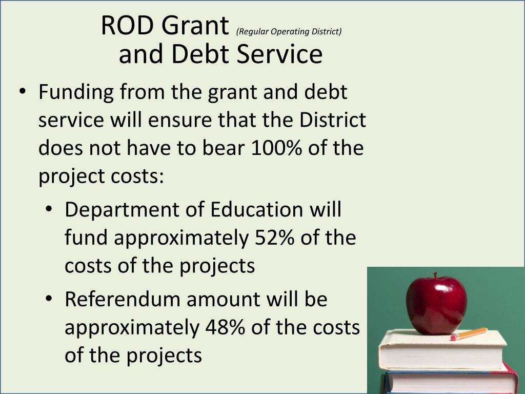 ROD Grant (Regular Operating District) and Debt Service • Funding from the grant and debt service will ensure that the District does not have to bear 100% of the project costs: • Department of Education will fund approximately 52% of the costs of the projects • Referendum amount will be approximately 48% of the costs of the projects