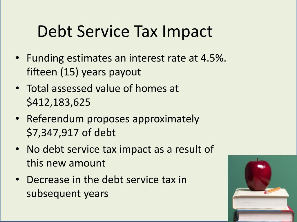 Debt Service Tax Impact • Funding estimates an interest rate at 4.5%. fifteen (15) years payout • Total assessed value of homes at $412,183,625 • Referendum proposes approximately $7,347,917 of debt • No debt service tax impact as a result of this new amount • Decrease in the debt service tax in subsequent years