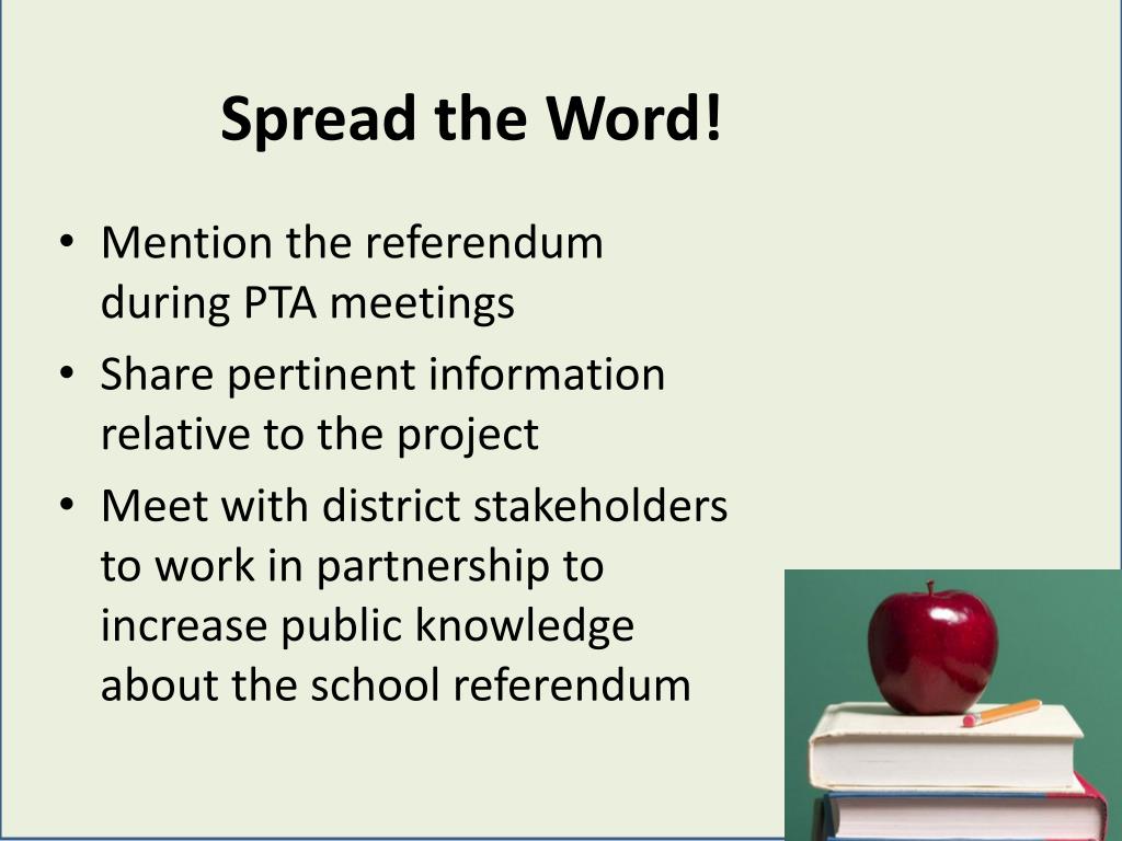 Spread the Word! • Mention the referendum during PTA meetings • Share pertinent information relative to the project • Meet with district stakeholders to work in partnership to increase public knowledge about the school referendum