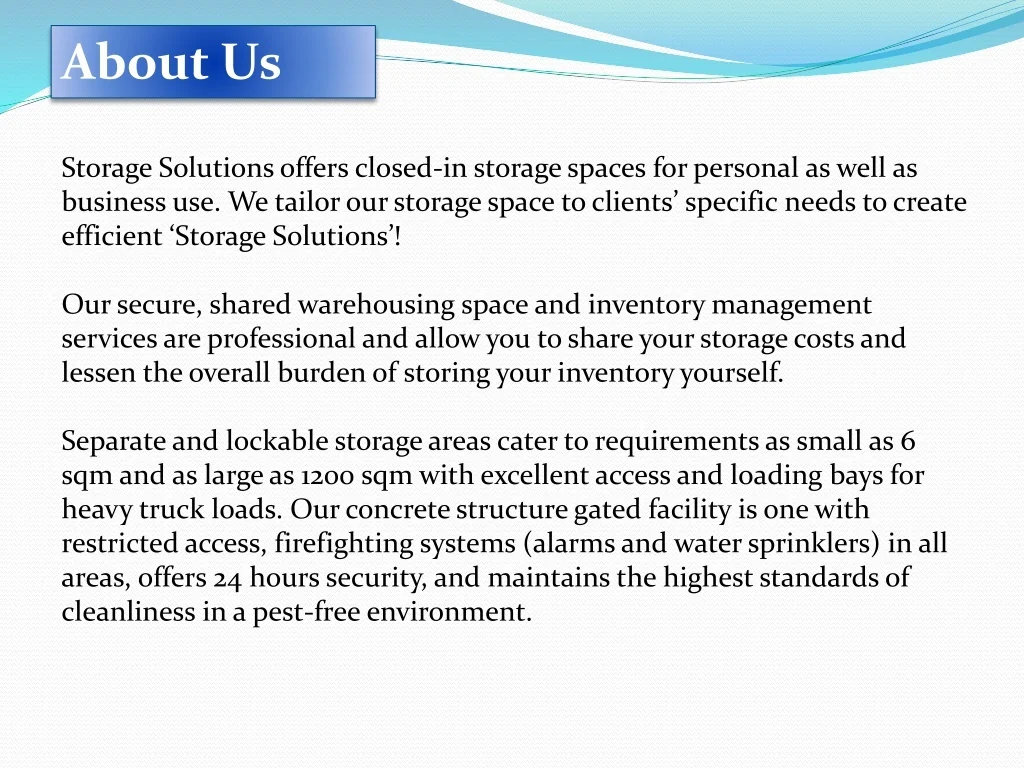 About Us Storage Solutions offers closed-in storage spaces for personal as well as business use. We tailor our storage space to clients’ specific needs to create efficient ‘Storage Solutions’! Our secure, shared warehousing space and inventory management services are professional and allow you to share your storage costs and lessen the overall burden of storing your inventory yourself. Separate and lockable storage areas cater to requirements as small as 6 sqm and as large as 1200 sqm with excellent access and loading bays for heavy truck loads. Our concrete structure gated facility is one with restricted access, firefighting systems (alarms and water sprinklers) in all areas, offers 24 hours security, and maintains the highest standards of cleanliness in a pest-free environment.