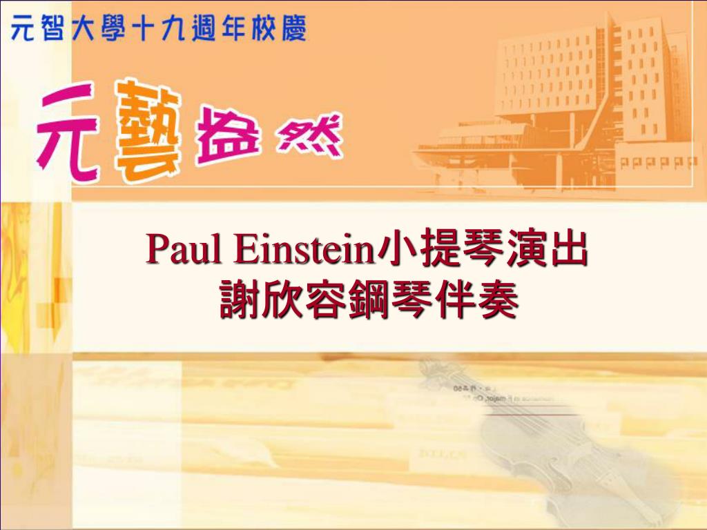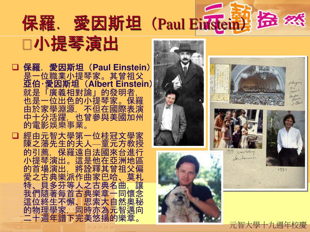 保羅.愛因斯坦(Paul Einstein)是一位職業小提琴家。其曾祖父亞伯‧愛因斯坦(Albert Einstein)就是「廣義相對論」的發明者,也是一位出色的小提琴家。保羅由於家學淵源,不但在國際表演中十分活躍,也曾參與美國加州的電影娛樂事業。 經由元智大學第一位桂冠文學家陳之藩先生的夫人—童元方教授的引薦,保羅遠自法國來台進行小提琴演出。這是他在亞洲地區的首場演出,將詮釋其曾祖父偏愛之古典樂派作曲家巴哈、莫札特、貝多芬等人之古典名曲,讓我們隨著每首古典樂章一同懷念這位終生不懈、思索大自然奧秘的物理學家,同時亦為元智邁向二十週年譜下完美悠揚的樂章。 保羅.愛因斯坦(Paul Einstein)小提琴演出