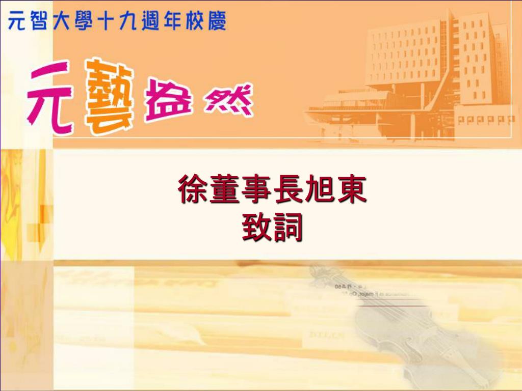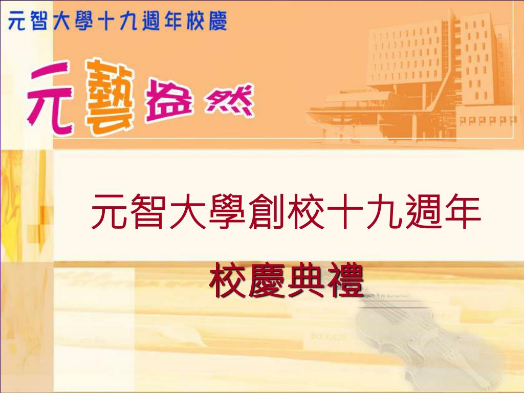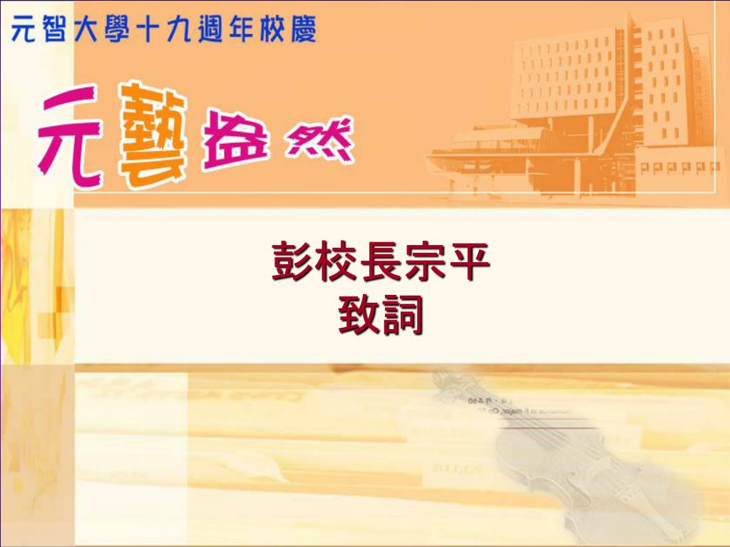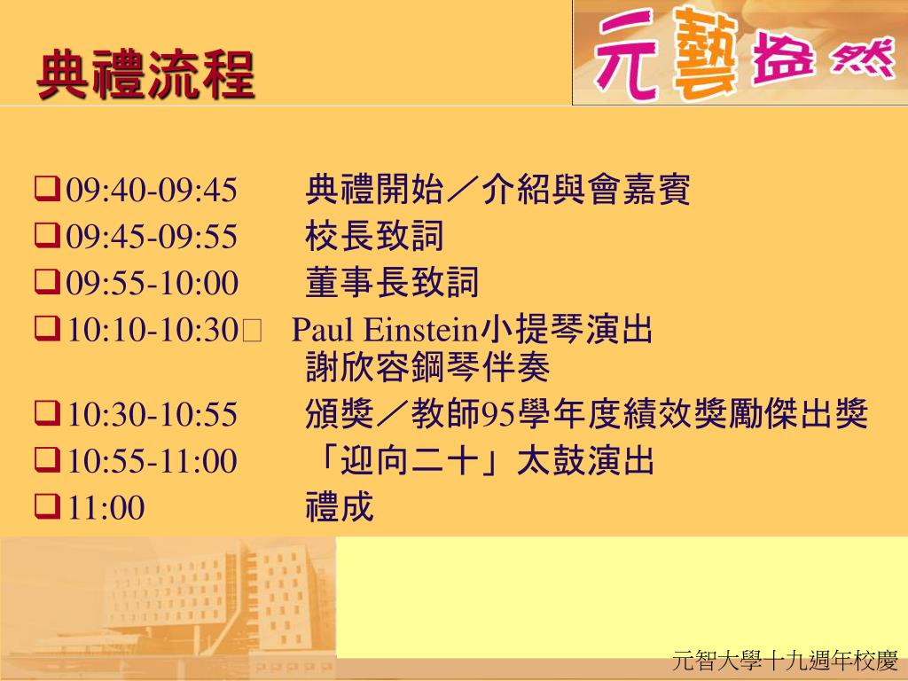 元智大學創校十九週年 校慶典禮. 典禮流程. 09:40-09:45 典禮開始/介紹與會嘉賓 09:45-09:55 校長致詞 09:55-10:00 董事長致詞 10:10-10:30 Paul Einstein 小提琴演出 謝欣容鋼琴伴奏 10:30-10:55 頒獎/教師 95 學年度績效獎勵傑出獎 10:55-11:00 「迎向二十」太鼓演出 11:00 禮成 . 介紹與會嘉賓. 彭校長宗平 致詞. 徐董事長旭東 致詞. Paul Einstein 小提琴演出 謝欣容鋼琴伴奏.