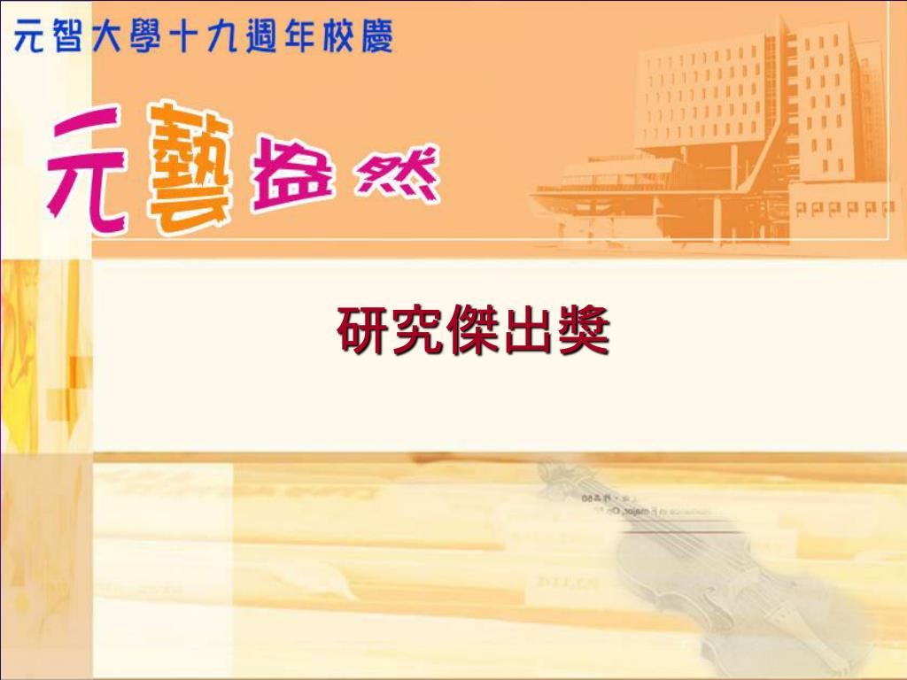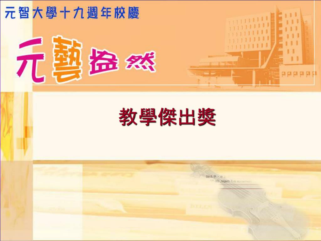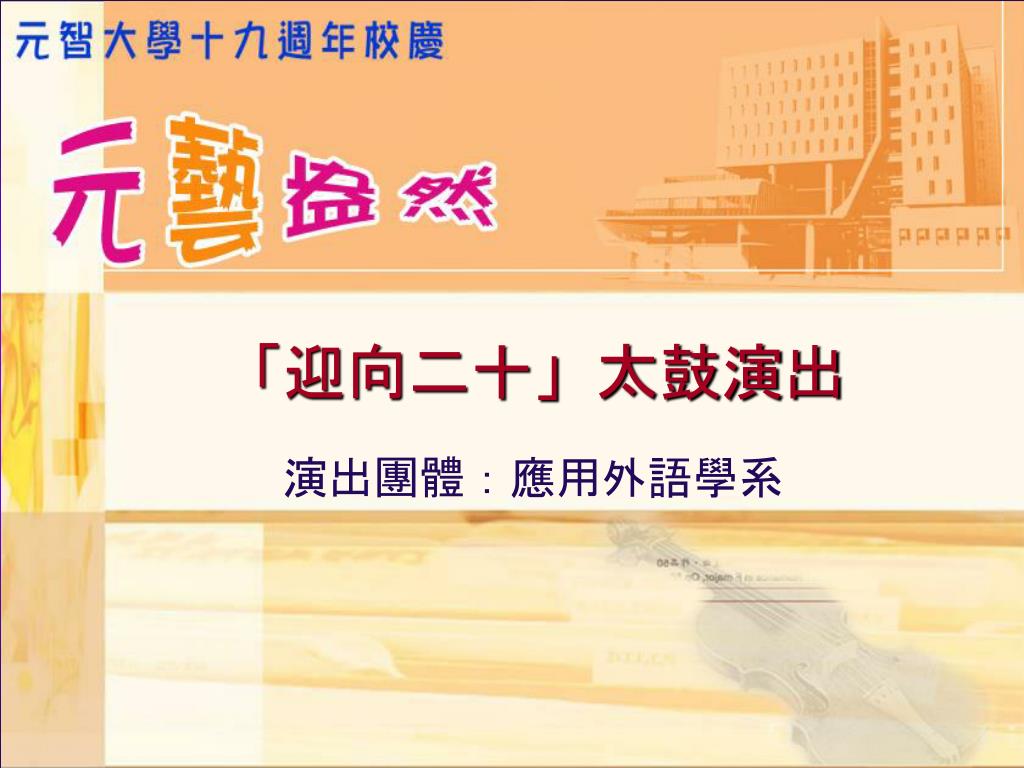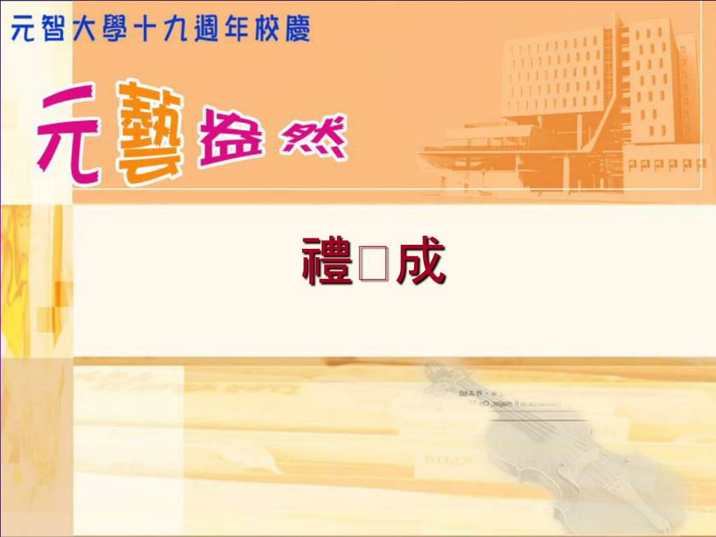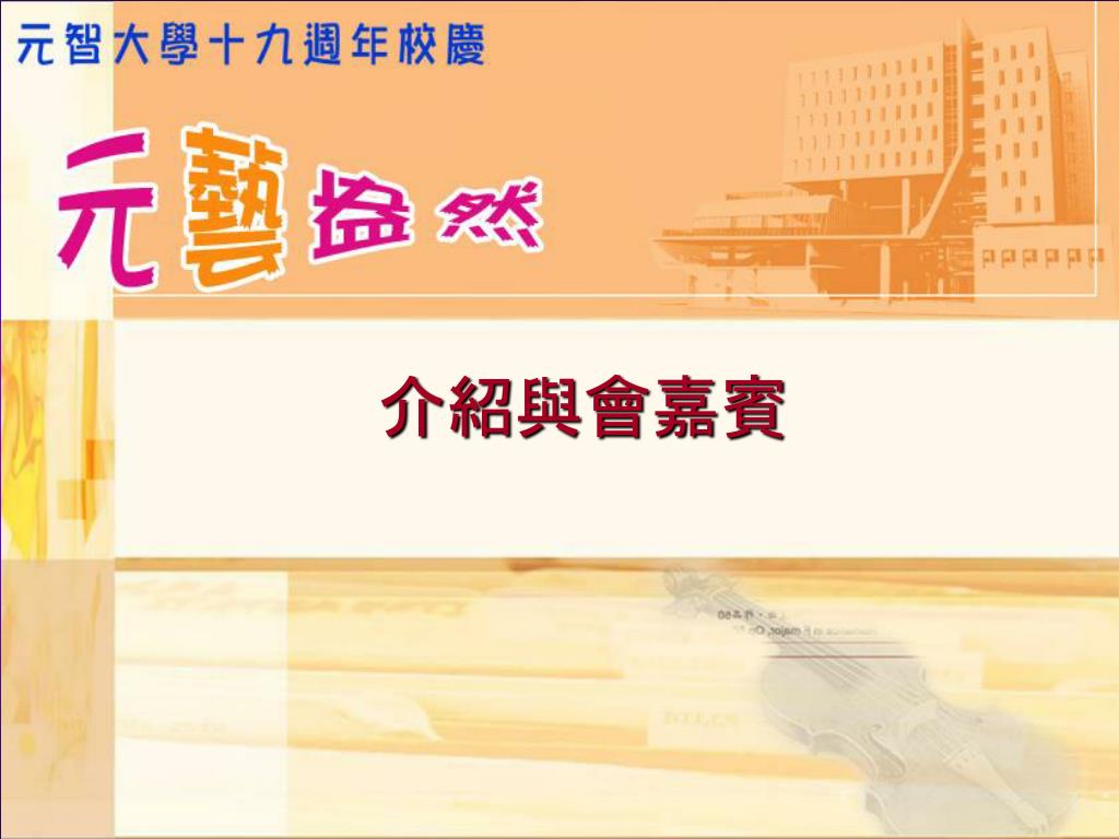 元智大學創校十九週年 校慶典禮. 典禮流程. 09:40-09:45 典禮開始/介紹與會嘉賓 09:45-09:55 校長致詞 09:55-10:00 董事長致詞 10:10-10:30 Paul Einstein 小提琴演出 謝欣容鋼琴伴奏 10:30-10:55 頒獎/教師 95 學年度績效獎勵傑出獎 10:55-11:00 「迎向二十」太鼓演出 11:00 禮成 . 介紹與會嘉賓. 彭校長宗平 致詞. 徐董事長旭東 致詞. Paul Einstein 小提琴演出 謝欣容鋼琴伴奏.