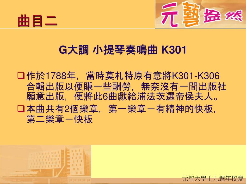 曲目二 G大調 小提琴奏鳴曲 K301 • 作於1788年,當時莫札特原有意將K301-K306合輯出版以便賺一些酬勞,無奈沒有一間出版社願意出版,便將此6曲獻給浦法茨選帝侯夫人。 • 本曲共有2個樂章,第一樂章-有精神的快板,第二樂章-快板