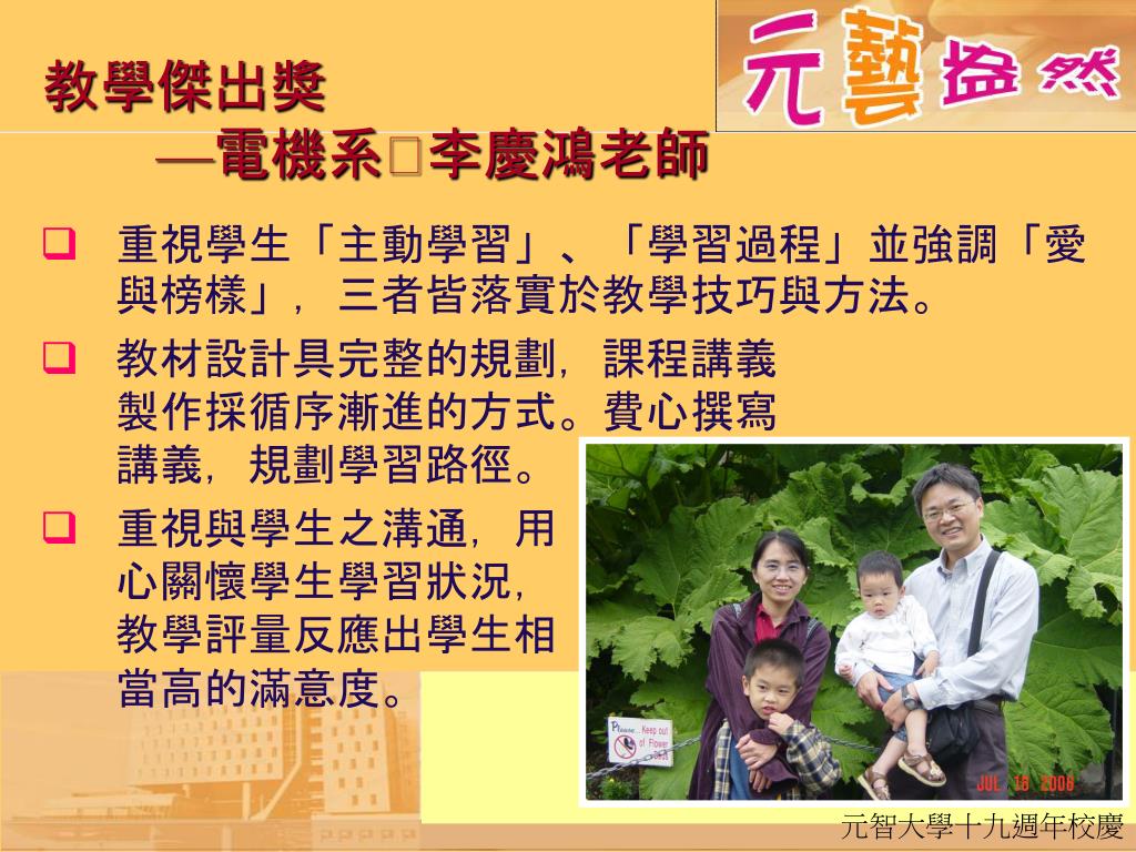 教學傑出獎—電機系李慶鴻老師 • 重視學生「主動學習」、「學習過程」並強調「愛與榜樣」,三者皆落實於教學技巧與方法。 • 教材設計具完整的規劃,課程講義製作採循序漸進的方式。費心撰寫講義,規劃學習路徑。 • 重視與學生之溝通,用心關懷學生學習狀況,教學評量反應出學生相當高的滿意度。