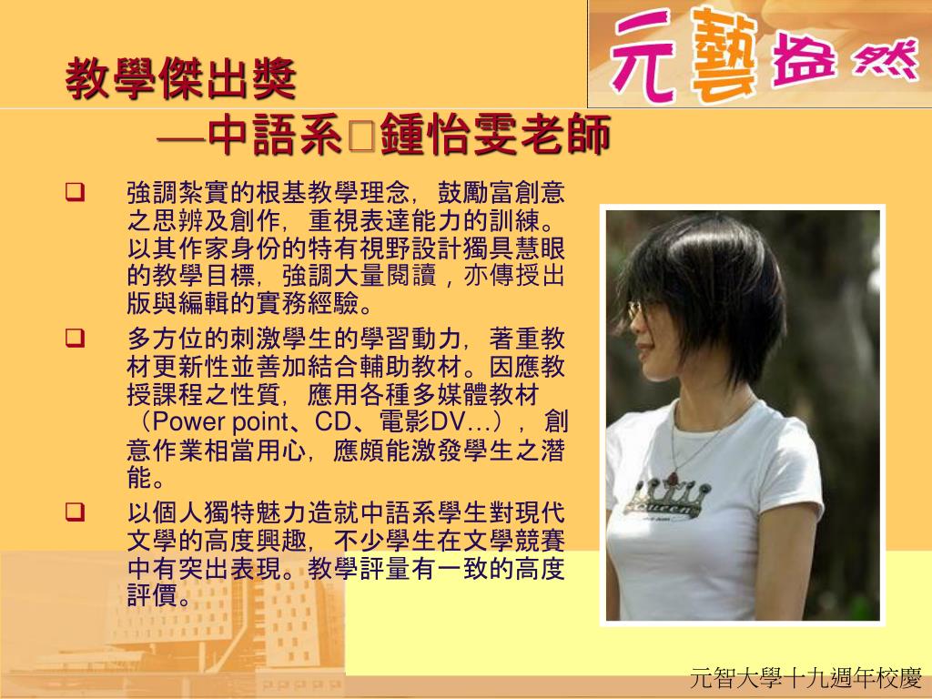強調紮實的根基教學理念,鼓勵富創意之思辨及創作,重視表達能力的訓練。以其作家身份的特有視野設計獨具慧眼的教學目標,強調大量閱讀,亦傳授出版與編輯的實務經驗。強調紮實的根基教學理念,鼓勵富創意之思辨及創作,重視表達能力的訓練。以其作家身份的特有視野設計獨具慧眼的教學目標,強調大量閱讀,亦傳授出版與編輯的實務經驗。 多方位的刺激學生的學習動力,著重教材更新性並善加結合輔助教材。因應教授課程之性質,應用各種多媒體教材(Power point、CD、電影DV…),創意作業相當用心,應頗能激發學生之潛能。 以個人獨特魅力造就中語系學生對現代文學的高度興趣,不少學生在文學競賽中有突出表現。教學評量有一致的高度評價。 教學傑出獎—中語系鍾怡雯老師