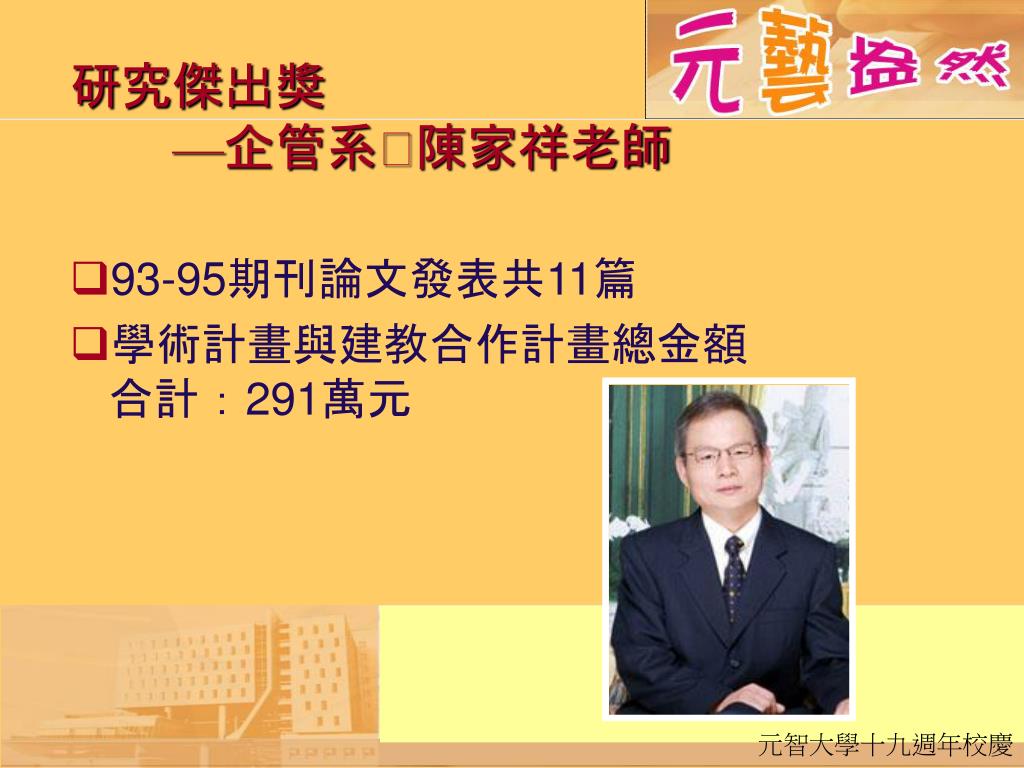 研究傑出獎—企管系陳家祥老師 • 93-95期刊論文發表共11篇 • 學術計畫與建教合作計畫總金額合計:291萬元