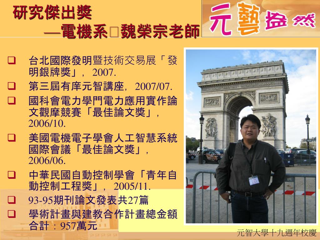 台北國際發明暨技術交易展「發明銀牌獎」,2007.台北國際發明暨技術交易展「發明銀牌獎」,2007. 第三屆有庠元智講座,2007/07. 國科會電力學門電力應用實作論文觀摩競賽「最佳論文獎」,2006/10. 美國電機電子學會人工智慧系統國際會議「最佳論文獎」,2006/06. 中華民國自動控制學會「青年自動控制工程獎」,2005/11. 93-95期刊論文發表共27篇 學術計畫與建教合作計畫總金額合計:957萬元 研究傑出獎—電機系魏榮宗老師