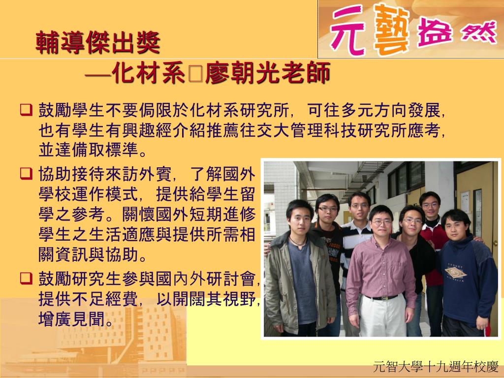 輔導傑出獎—化材系廖朝光老師 • 鼓勵學生不要侷限於化材系研究所,可往多元方向發展,也有學生有興趣經介紹推薦往交大管理科技研究所應考,並達備取標準。 • 協助接待來訪外賓,了解國外學校運作模式,提供給學生留學之參考。關懷國外短期進修學生之生活適應與提供所需相關資訊與協助。 • 鼓勵研究生參與國內外研討會,提供不足經費,以開闊其視野,增廣見聞。