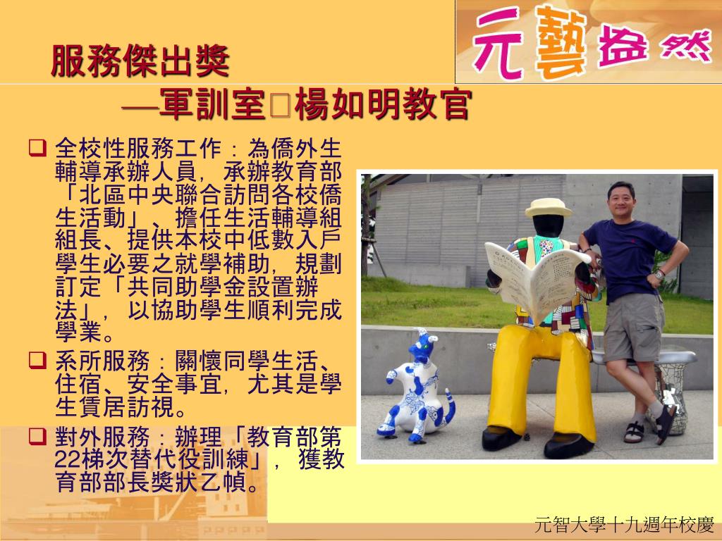 服務傑出獎—軍訓室楊如明教官 • 全校性服務工作:為僑外生輔導承辦人員,承辦教育部「北區中央聯合訪問各校僑生活動」、擔任生活輔導組組長、提供本校中低數入戶學生必要之就學補助,規劃訂定「共同助學金設置辦法」,以協助學生順利完成學業。 • 系所服務:關懷同學生活、住宿、安全事宜,尤其是學生賃居訪視。 • 對外服務:辦理「教育部第22梯次替代役訓練」,獲教育部部長獎狀乙幀。
