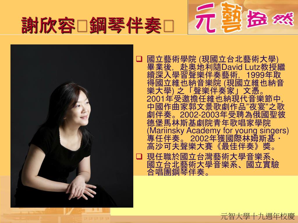 謝欣容鋼琴伴奏 • 國立藝術學院 (現國立台北藝術大學) 畢業後,赴奧地利隨David Lutz教授繼續深入學習聲樂伴奏藝術,1999年取得國立維也納音樂院 (現國立維也納音樂大學) 之「聲樂伴奏家」文憑。 2001年受邀擔任維也納現代音樂節中,中國作曲家郭文景歌劇作品”夜宴”之歌劇伴奏。2002-2003年受聘為俄國聖彼德堡馬林斯基劇院青年歌唱家學院(Mariinsky Academy for young singers) 專任伴奏。 2002年獲國際林姆斯基 ・高沙可夫聲樂大賽《最佳伴奏》獎。 • 現任職於國立台灣藝術大學音樂系、國立台北藝術大學音樂系、國立實驗合唱團鋼琴伴奏。