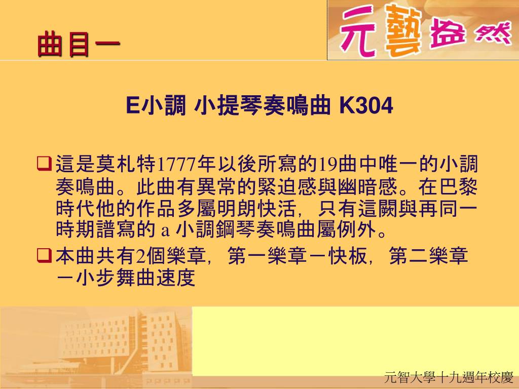 曲目一 E小調 小提琴奏鳴曲 K304 • 這是莫札特1777年以後所寫的19曲中唯一的小調奏鳴曲。此曲有異常的緊迫感與幽暗感。在巴黎時代他的作品多屬明朗快活,只有這闕與再同一時期譜寫的 a 小調鋼琴奏鳴曲屬例外。 • 本曲共有2個樂章,第一樂章-快板,第二樂章-小步舞曲速度