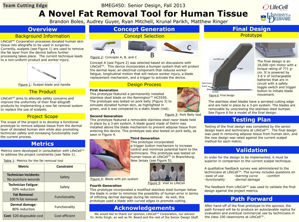 Team Cutting Edge. BMEG450: Senior Design, Fall 2013. A Novel Fat Removal Tool for Human Tissue. Brandon Boles, Audrey Guyer, Ryan Mitchell, Krunal Parikh, Matthew Ringer. Final Design. Concept Generation. Overview. Prototype. Background Information. Concept Selection.