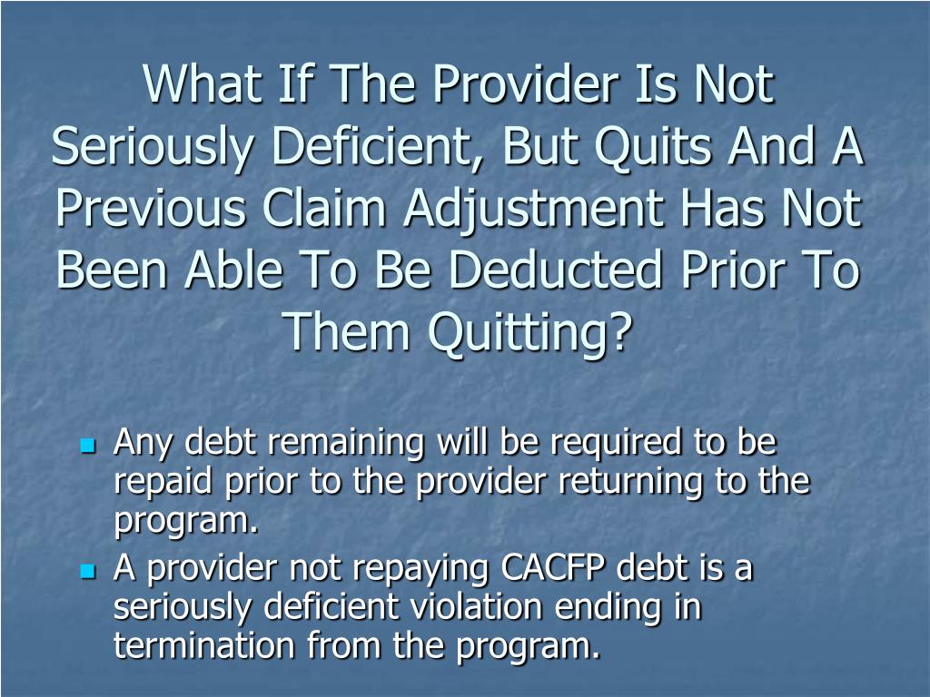 What If The Provider Is Not Seriously Deficient, But Quits And A Previous Claim Adjustment Has Not Been Able To Be Deducted Prior To Them Quitting? • Any debt remaining will be required to be repaid prior to the provider returning to the program. • A provider not repaying CACFP debt is a seriously deficient violation ending in termination from the program.