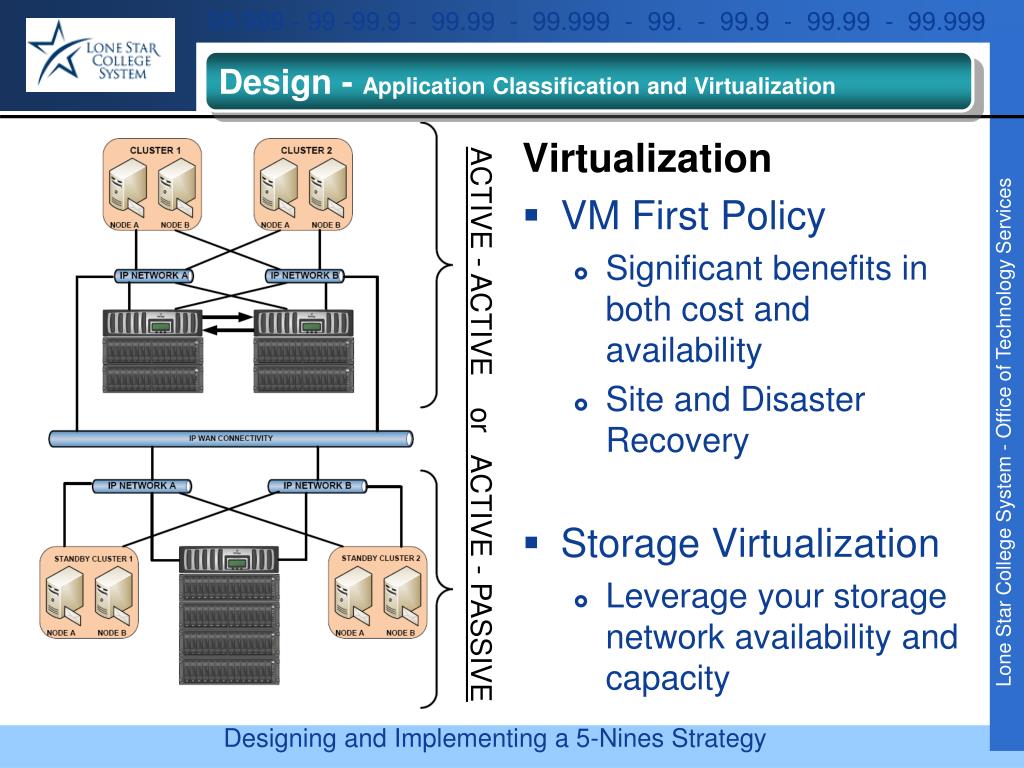 Design - Application Classification and Virtualization Virtualization • VM First Policy • Significant benefits in both cost and availability • Site and Disaster Recovery • Storage Virtualization • Leverage your storage network availability and capacity ACTIVE - ACTIVE or ACTIVE - PASSIVE