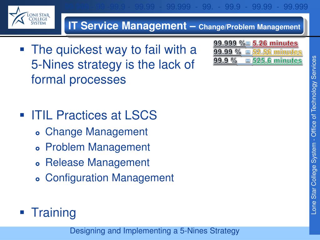 IT Service Management – Change/Problem Management 99.999 % = 5.26 minutes 99.99 % = 52.56 minutes 99.9 % = 525.6 minutes • The quickest way to fail with a 5-Nines strategy is the lack of formal processes • ITIL Practices at LSCS • Change Management • Problem Management • Release Management • Configuration Management • Training
