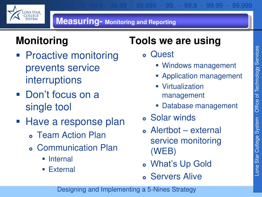Measuring- Monitoring and Reporting Tools we are using • Quest • Windows management • Application management • Virtualization management • Database management • Solar winds • Alertbot – external service monitoring (WEB) • What’s Up Gold • Servers Alive Monitoring • Proactive monitoring prevents service interruptions • Don’t focus on a single tool • Have a response plan • Team Action Plan • Communication Plan • Internal • External