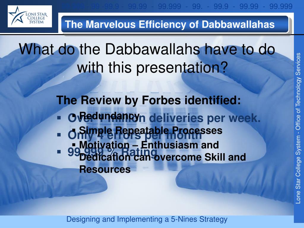 The Marvelous Efficiency of Dabbawallahas • The Review by Forbes identified: • Redundancy • Simple Repeatable Processes • Motivation – Enthusiasm and Dedication can overcome Skill and Resources • Over 1 million deliveries per week. • Only 4 errors per month • 99.999 % Rating What do the Dabbawallahs have to do with this presentation?