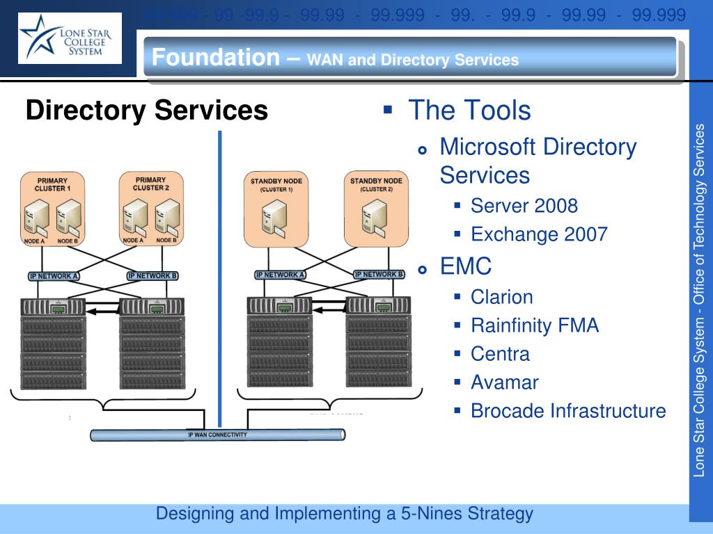 Foundation – WAN and Directory Services • The Tools • Microsoft Directory Services • Server 2008 • Exchange 2007 • EMC • Clarion • Rainfinity FMA • Centra • Avamar • Brocade Infrastructure Directory Services