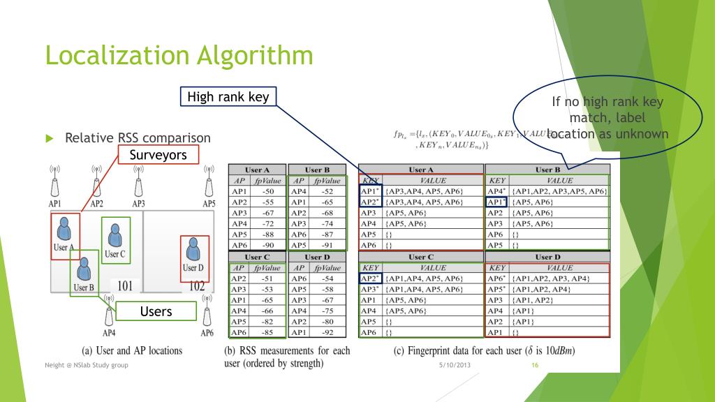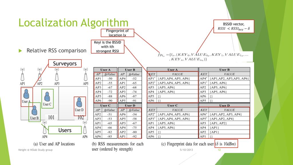 Localization Algorithm BSSID vector, Fingerprint of location lx Keyi is the BSSID with ith strongest RSSI • Relative RSS comparison Surveyors Users Neight @ NSlab Study group