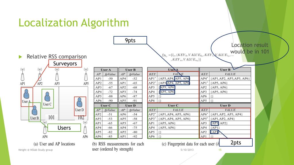 Localization Algorithm Location result would be in 101 8pts • Relative RSS comparison Surveyors Users 1pts Neight @ NSlab Study group