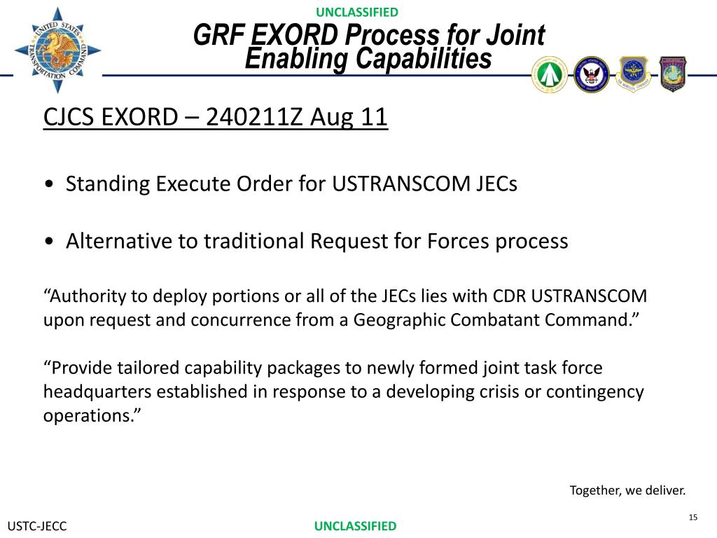 GRF EXORD Process for JointEnabling Capabilities CJCS EXORD – 240211Z Aug 11 • Standing Execute Order for USTRANSCOM JECs • Alternative to traditional Request for Forces process “Authority to deploy portions or all of the JECs lies with CDR USTRANSCOM upon request and concurrence from a Geographic Combatant Command.” “Provide tailored capability packages to newly formed joint task force headquarters established in response to a developing crisis or contingency operations.”