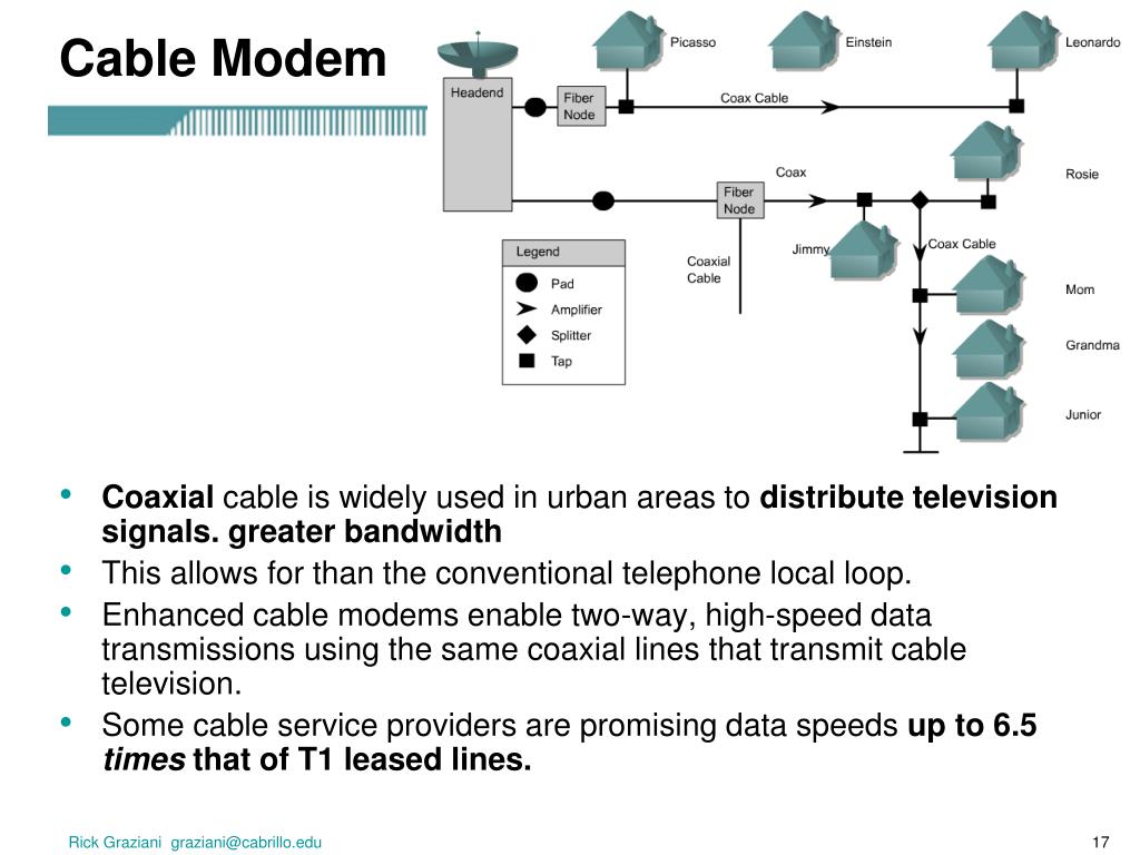 Cable Modem • Coaxial cable is widely used in urban areas to distribute television signals. greater bandwidth • This allows for than the conventional telephone local loop. • Enhanced cable modems enable two-way, high-speed data transmissions using the same coaxial lines that transmit cable television. • Some cable service providers are promising data speeds up to 6.5 times that of T1 leased lines. Rick Graziani graziani@cabrillo.edu