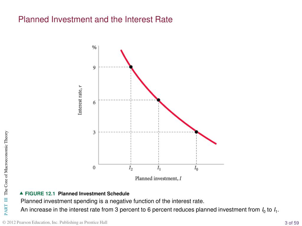 Planned Investment and the Interest Rate FIGURE 12.1 Planned Investment Schedule Planned investment spending is a negative function of the interest rate. An increase in the interest rate from 3 percent to 6 percent reduces planned investment from I0 to I1.