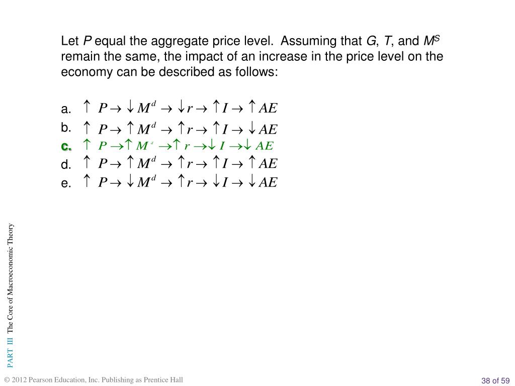 Let P equal the aggregate price level. Assuming that G, T, and MS remain the same, the impact of an increase in the price level on the economy can be described as follows: a. b. c. d. e.