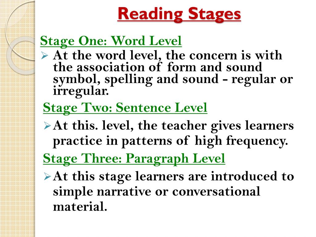Reading Stages Stage One: Word Level • At the word level, the concern is with the association of form and sound symbol, spelling and sound - regular or irregular. Stage Two: Sentence Level • At this. level, the teacher gives learners practice in patterns of high frequency. Stage Three: Paragraph Level • At this stage learners are introduced to simple narrative or conversational material.