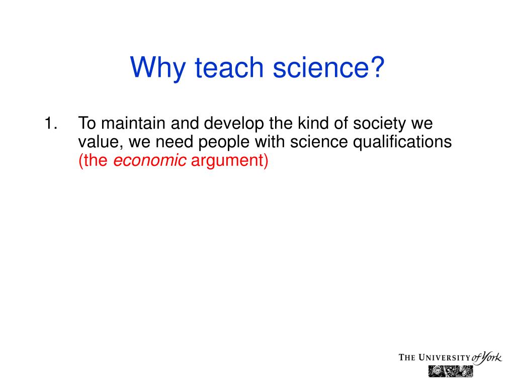 Why teach science? • To maintain and develop the kind of society we value, we need people with science qualifications (the economic argument) • It is practically useful to have some scientific knowledge (the utility argument)