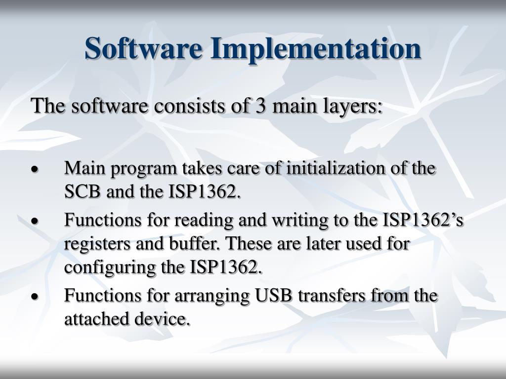 Software Implementation The software consists of 3 main layers: • Main program takes care of initialization of the SCB and the ISP1362. • Functions for reading and writing to the ISP1362’s registers and buffer. These are later used for configuring the ISP1362. • Functions for arranging USB transfers from the attached device.