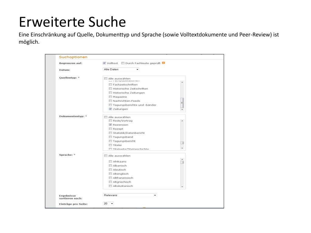 Erweiterte SucheEine Einschränkung auf Quelle, Dokumenttyp und Sprache (sowie Volltextdokumente und Peer-Review) ist möglich.
