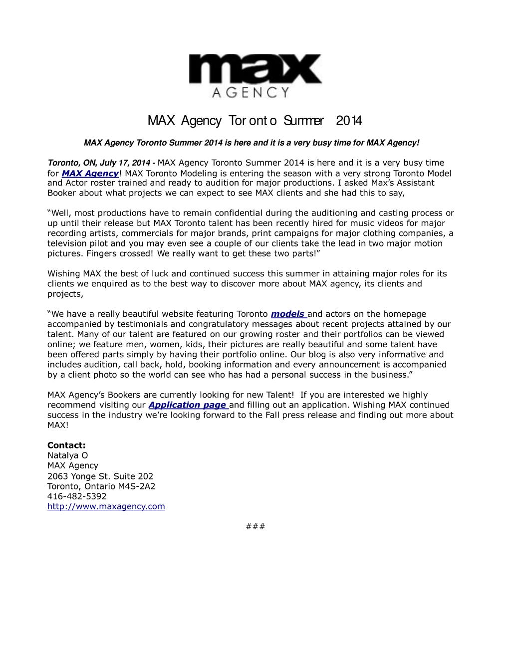 MAXAgencyTorontoSummer2014 MAXAgencyTorontoSummer 2014 ishere anditisa very busytime for MAXAgency!Toronto,ON, July 17,2014 -MAX AgencyTorontoSummer2014ishereand it isaverybusytime forMAXAgency!MAXTorontoModeling isentering theseasonwithaverystrong TorontoModel and Actorrostertrained and readytoauditionformajorproductions.IaskedMax’sAssistantBookerabout whatprojectswecanexpecttoseeMAX clientsand shehadthistosay, “Well,most productionshavetoremainconfidential during theauditioningandcasting processorup until theirreleasebut MAX Torontotalent has beenrecentlyhired formusicvideosformajor recordingartists,commercialsformajorbrands,print campaignsformajor clothing companies,atelevisionpilot and youmayevenseeacoupleofour clientstaketheleadin twomajormotionpictures.Fingerscrossed!Wereallywant togetthesetwoparts!” Wishing MAX thebestofluckandcontinued success thissummerinattainingmajorrolesforitsclientsweenquired as tothebest waytodiscovermoreabout MAX agency,itsclientsandprojects, “Wehaveareally beautifulwebsitefeaturing Torontomodelsand actorson thehomepage accompanied by testimonialsand congratulatorymessagesabout recent projectsattained byourtalent.Manyofourtalent arefeatured onourgrowingrosterandtheirportfolioscanbeviewedonline;wefeaturemen,women,kids,theirpicturesarereallybeautiful and sometalent havebeenoffered partssimplybyhavingtheirportfolioonline. Ourblog isalsoveryinformativeandincludesaudition,callback,hold,booking informationandeveryannouncement isaccompaniedbyaclientphotoso the worldcansee whohashada personal successin thebusiness.” MAXAgency’sBookersarecurrentlylooking fornewTalent!Ifyouareinterestedwehighly recommend visiting ourApplicationpageandfilling outanapplication.Wishing MAX continuedsuccessintheindustrywe’relookingforward totheFallpressreleaseandfinding outmoreaboutMAX! Contact:NatalyaOMAXAgency 2063YongeSt.Suite202Toronto, OntarioM4S-2A2 416-482-5392 http://www.maxagency.com ###