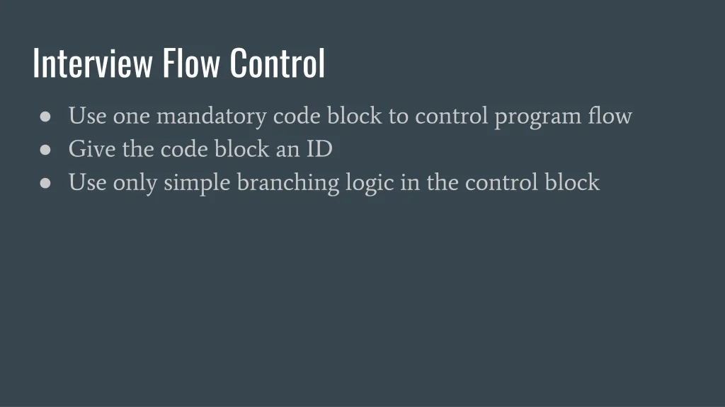 Interview Flow Control • Use one mandatory code block to control program flow • Give the code block an ID • Use only simple branching logic in the control block