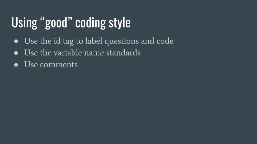 Using “good” coding style • Use the id tag to label questions and code • Use the variable name standards • Use comments
