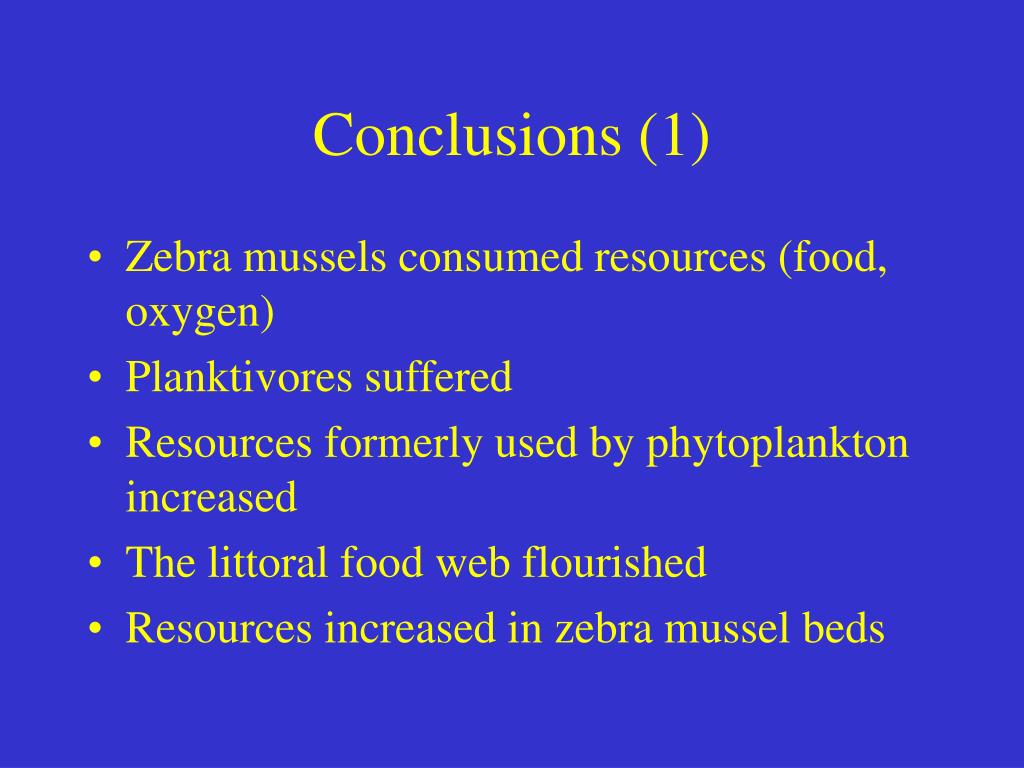 Conclusions (1) • Zebra mussels consumed resources (food, oxygen) • Planktivores suffered • Resources formerly used by phytoplankton increased • The littoral food web flourished • Resources increased in zebra mussel beds