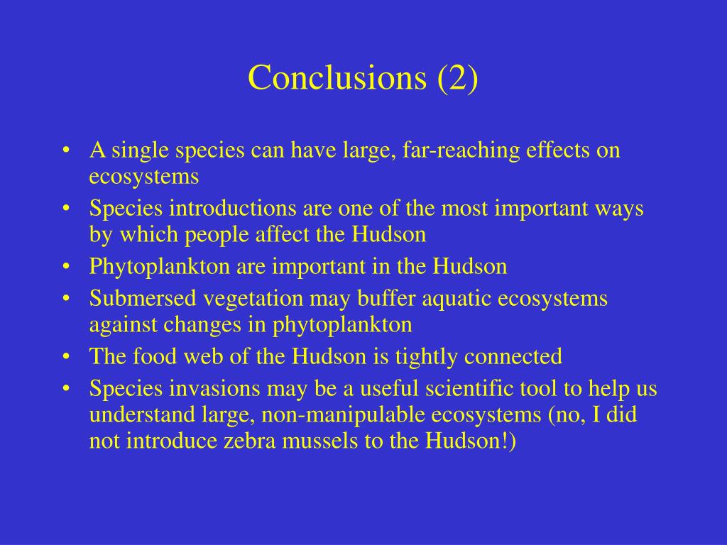 Conclusions (2) • A single species can have large, far-reaching effects on ecosystems • Species introductions are one of the most important ways by which people affect the Hudson • Phytoplankton are important in the Hudson • Submersed vegetation may buffer aquatic ecosystems against changes in phytoplankton • The food web of the Hudson is tightly connected • Species invasions may be a useful scientific tool to help us understand large, non-manipulable ecosystems (no, I did not introduce zebra mussels to the Hudson!)