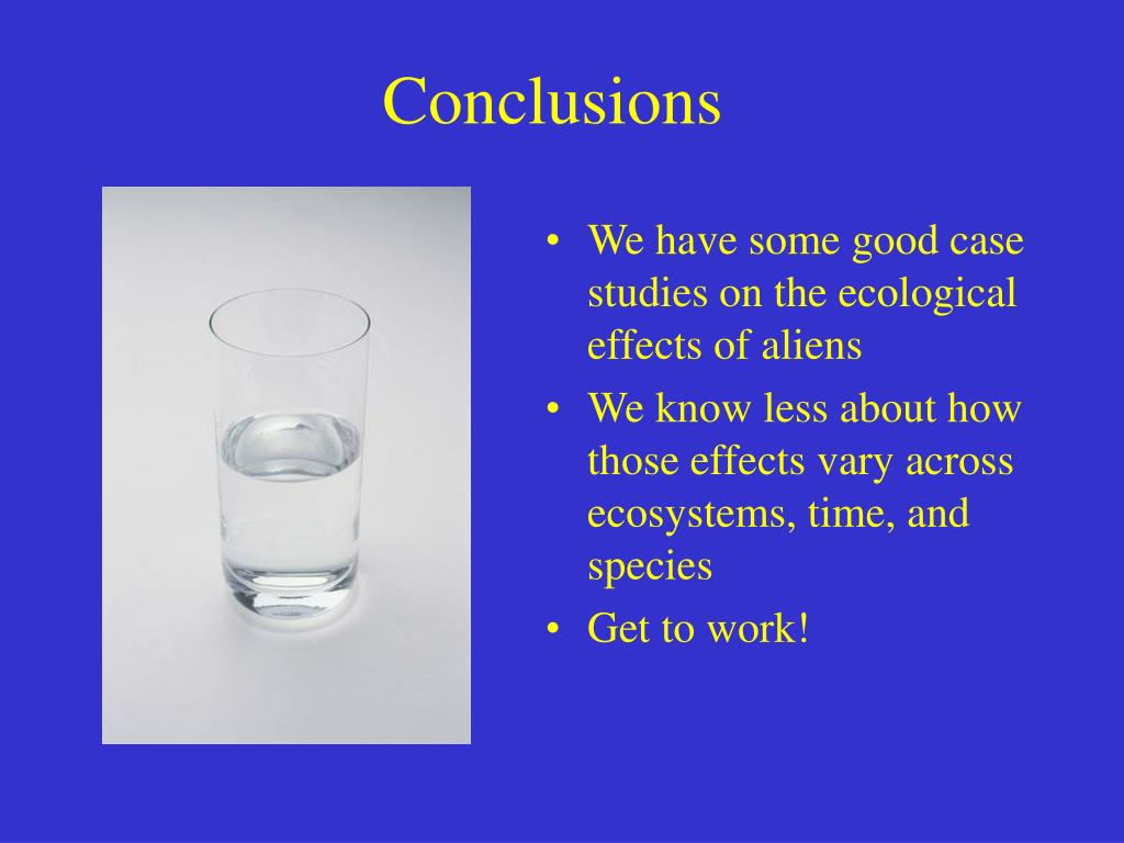 Conclusions • We have some good case studies on the ecological effects of aliens • We know less about how those effects vary across ecosystems, time, and species • Get to work!