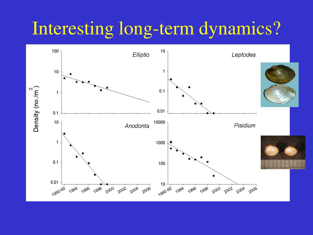 What’s up? • What mechanisms allow the long-term coexistence of zebra mussels and other bivalves? • How long does it take for these mechanisms to come into play? • Will they save North America’s native bivalves? • Do the Hudson River data represent the beginning of this dynamic, or are they an ephemeral blip? • How important, and how fast, are temporal changes in the effects of alien species?
